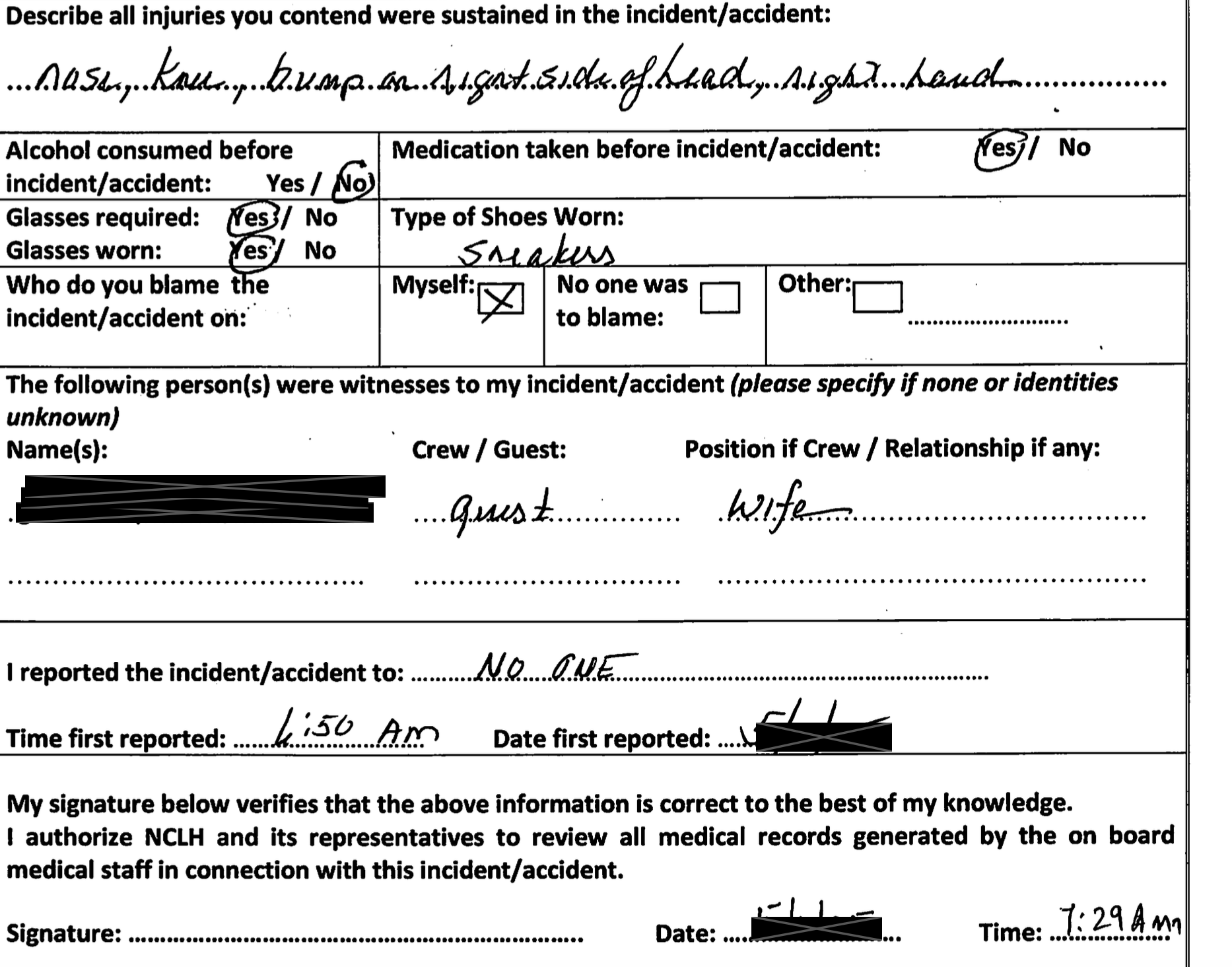 There is an intentional trick question on many of the incident report forms that the cruise lines count on either you missing or filling out incorrectly. The forms for most the major cruise lines have a question to the effect “who do you blame for the incident?” And they may only give you a check box with 3 choices to select from, “myself” or “No-one was to blame” or “other”. They don’t give a check box to prompt a passenger to blame the cruise line of to even think about it. We have seen time and time again, passengers leave this blank or worse, the cruise line checks the “myself” box and the passenger unknowingly signs it. How dishonest! Buts that’s what the crew is trained to do. Avoid liability. Below is an exemplar from an actual claim in our office from a passenger statement where the cruise line filled it because the client was too injured and his wife was providing the details. You can see the crew checked the “myself” box and acceding to my client’s wife, the security officer also signed her name! She was shocked when I sent them their so called “passenger statement”.